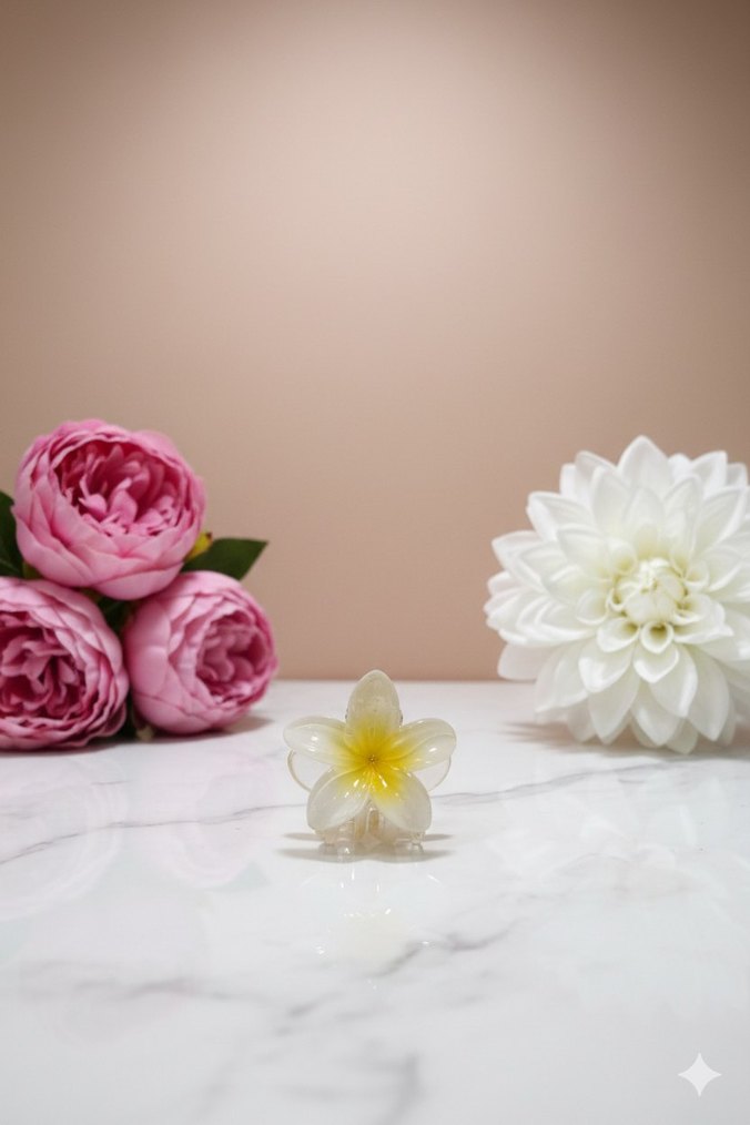 Şeffaf camdan yapılmış, pastel beyaz ve sarı tonlarında çiçek tasarımlı minimalist bohem tarzda saç aksesuarı.