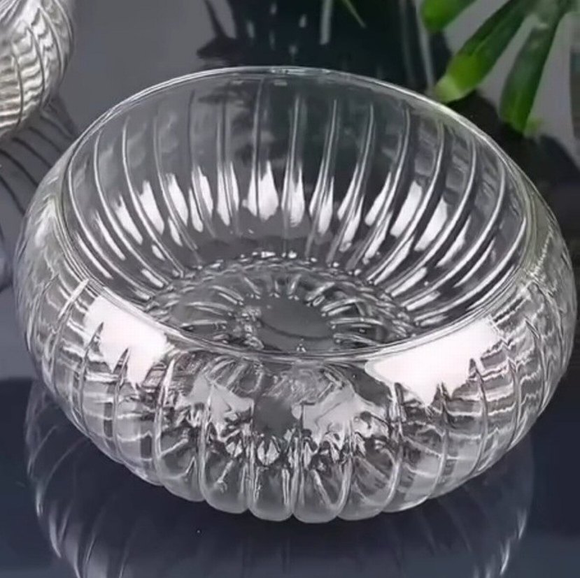 Yuvarlak şekilli, kabartmalı şeffaf cam kase, sofranıza dekoratif bir dokunuş katar. ️