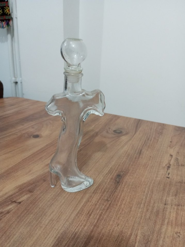 Kadın figürü şeklinde şeffaf cam şişe, yuvarlak kapaklıdır.