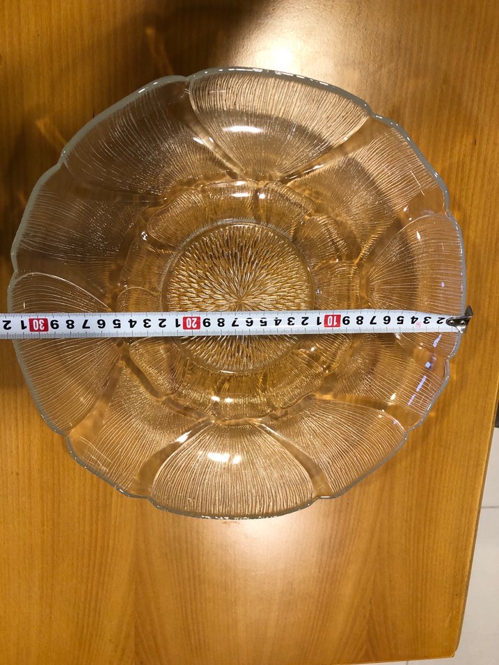 Yaklaşık 30 cm çapında, dokulu tasarıma sahip şeffaf cam tabak. Açık bej tonunda ve counterculture stilinde masa takımı ürünü. ️