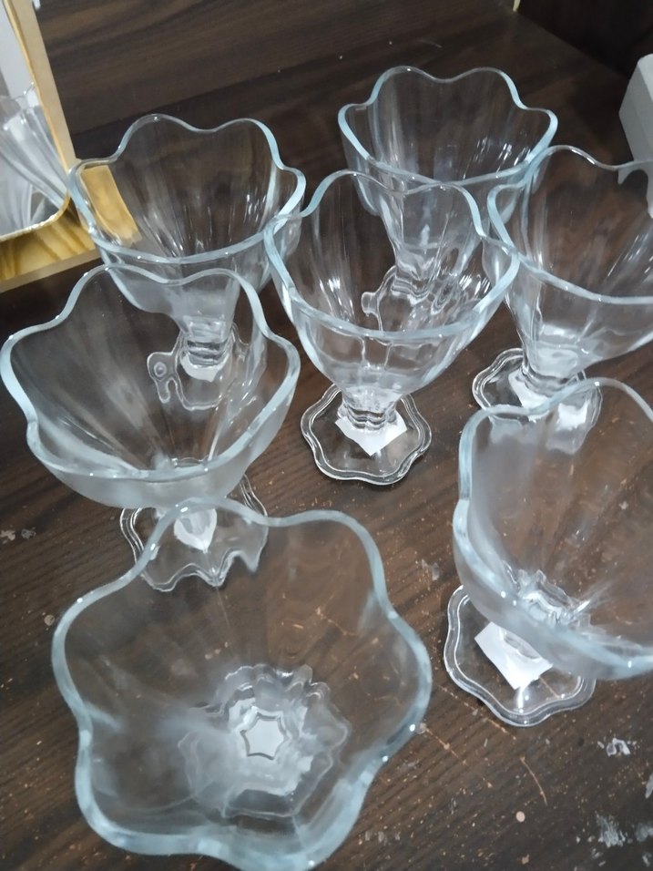 Çiçek şeklinde şeffaf cam dondurma kaseleri seti. Dalgalı kenar ve sağlam taban yapısına sahiptir.