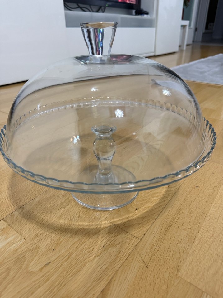 Şeffaf camdan yapılmış, üzeri gümüş saplı kapaklı kek standı. Tatlıları sergilemek ve korumak için uygun.