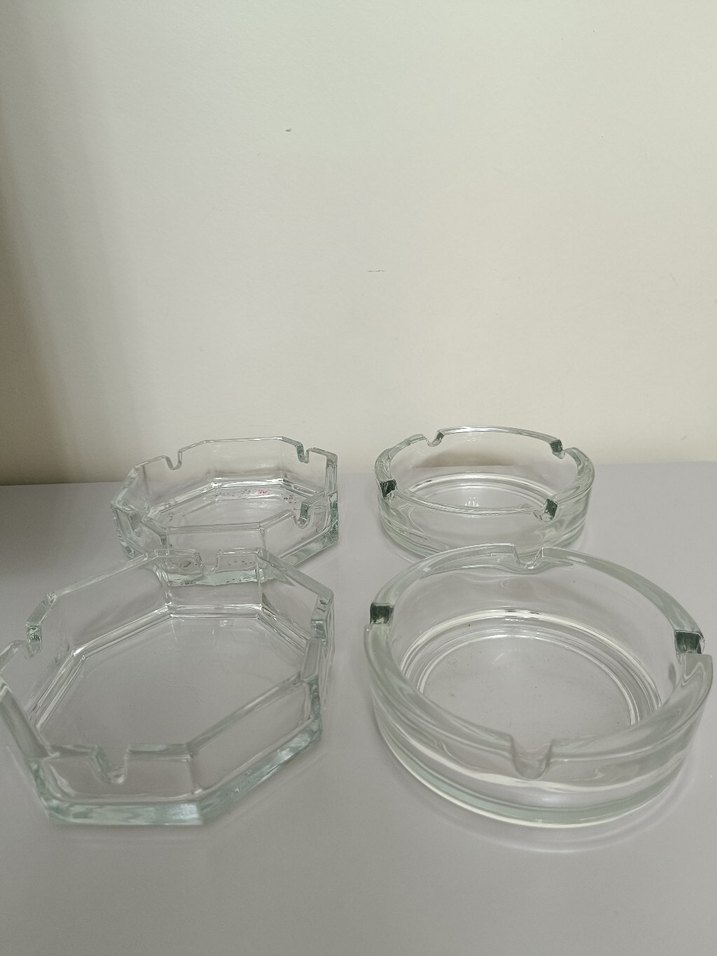 Dört adet şeffaf cam kül tablası, farklı şekillerde sade ve desensiz tasarımlara sahip. Masa kullanımı için uygundur.