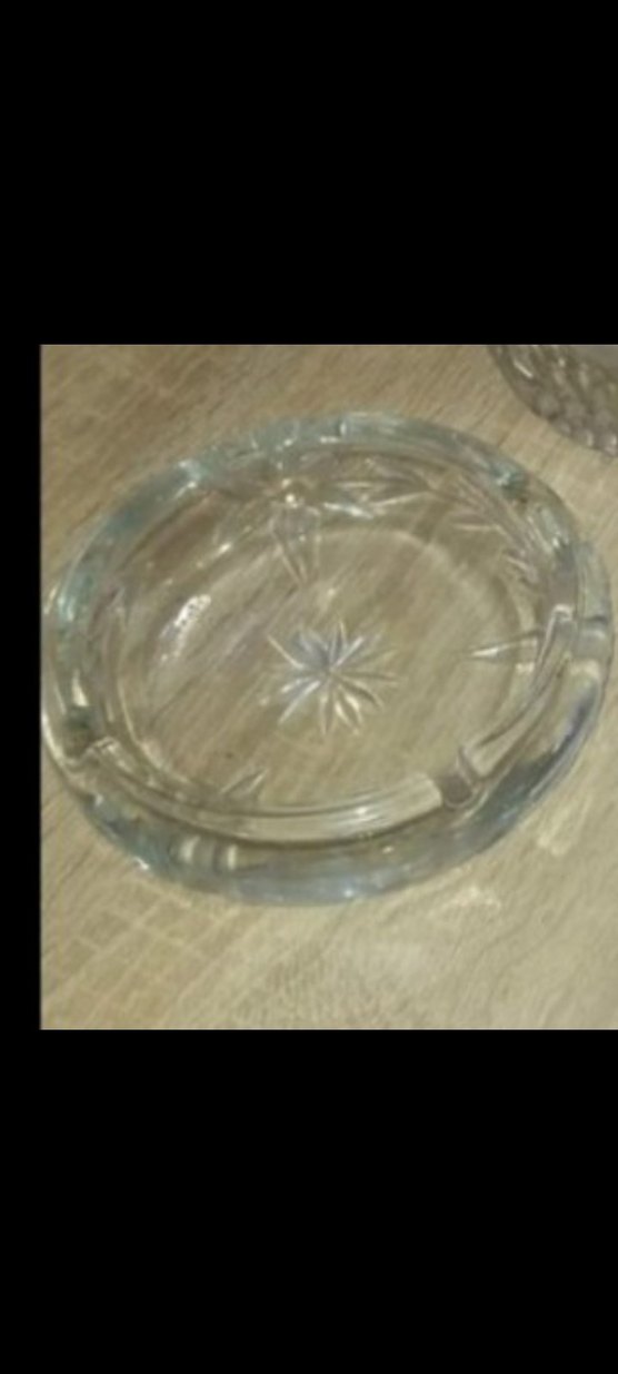 Şeffaf cam küllük, desensiz ve düz yüzeyli. Sigara koymak için oyukları bulunur ve hafif bej tonludur.