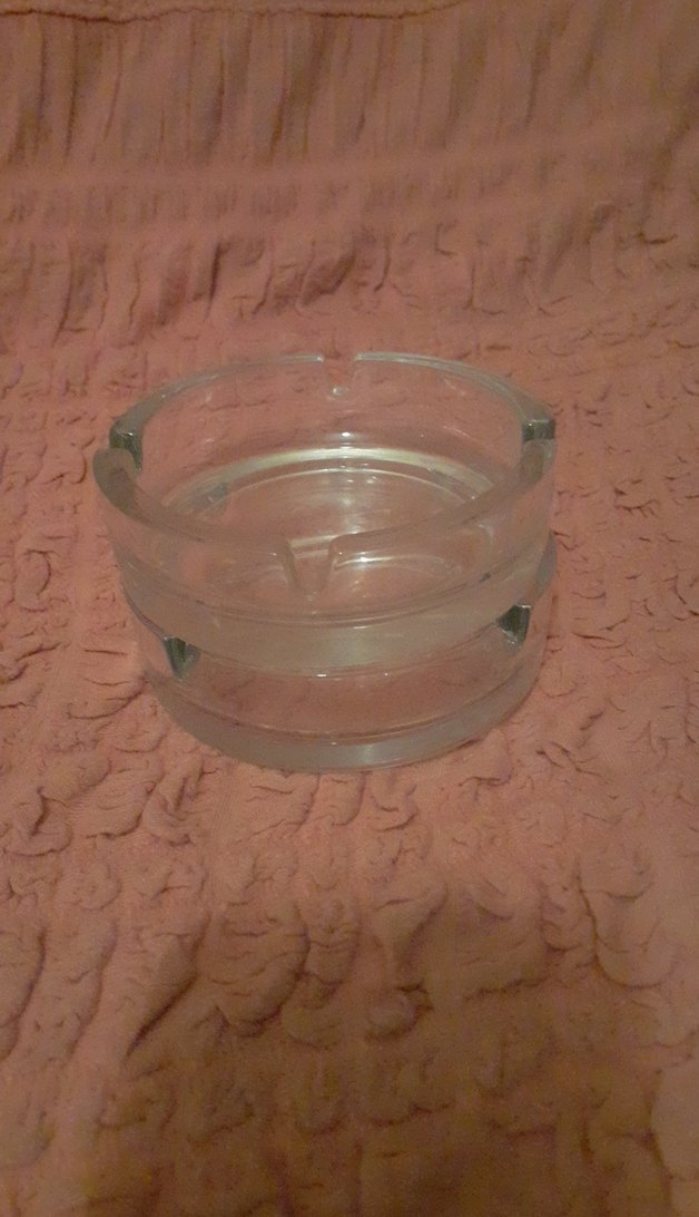 Şeffaf camdan yapılmış, yuvarlak ve sade tasarımlı bir küllük. 2 adet cam kulluk yazisiz.kullanilmadi