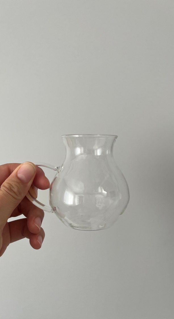 Küçük kulplu, yuvarlak gövdeli ve dar ağızlı şeffaf cam bardak. Sıcak veya soğuk içecekler için uygundur. ☕ısya dayanıklı