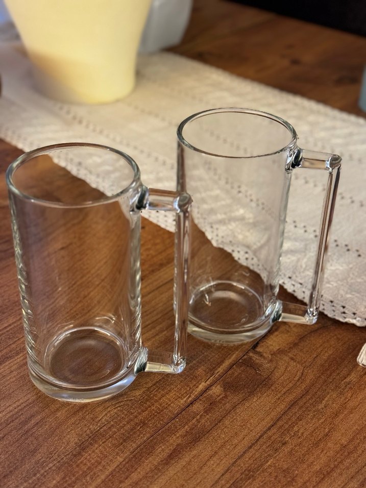 İki adet kulplu, şeffaf cam bardaktan oluşan set. Parlak ve pürüzsüz yüzeyiyle sıcak veya soğuk içecekler için uygundur. ☕