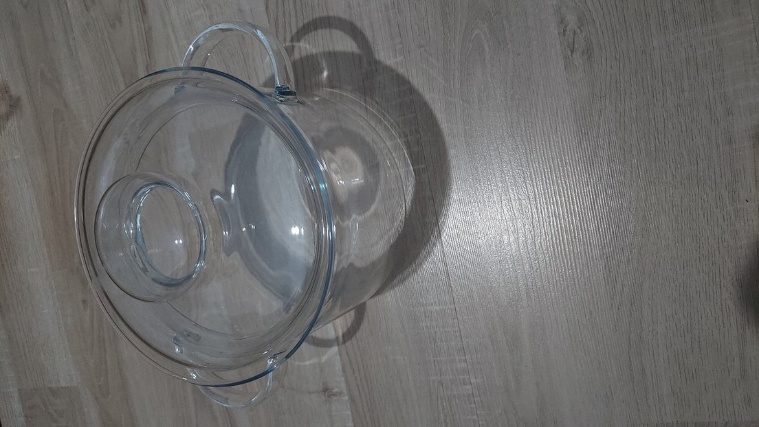 Kulplu ve kapaklı şeffaf cam tencere, desensiz ve modern counterculture tarzında. Gri zeminde, mavi tonlarla uyumlu.
