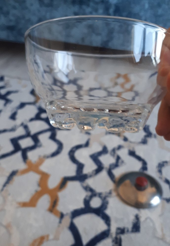 Küçük porsiyonlar için şeffaf cam mini kase, sade tasarımlı. Açık mavi arka plan şıklığını artırır.