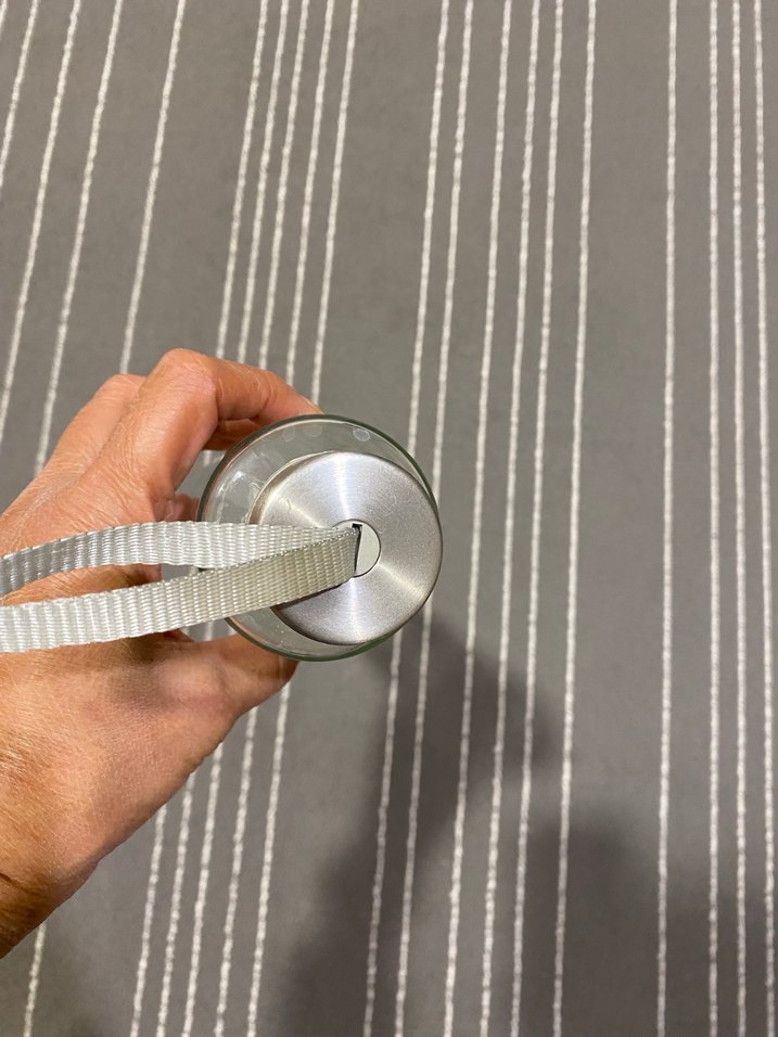 Şeffaf cam su şişesi, metal kapak ve bej taşıma kayışıyla pratik kullanım sağlar. İnce tasarımı elde rahat tutuş sunar.