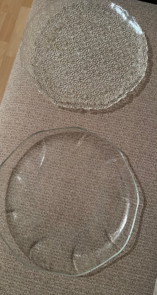 Çağdaş tasarıma sahip, dalgalı kenarlı şeffaf cam tabak ve dokulu bej desenli tabak seti. Modern sadelik ve hafif dokunuşlar sunar. ️