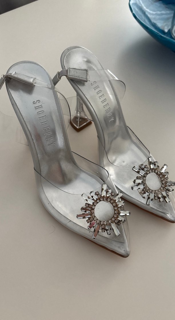 Şeffaf cam topuklu, parlak beyaz renkte, payetli detaylara sahip kadın abiye ayakkabısı, düğün ve özel etkinlikler için uygundur.