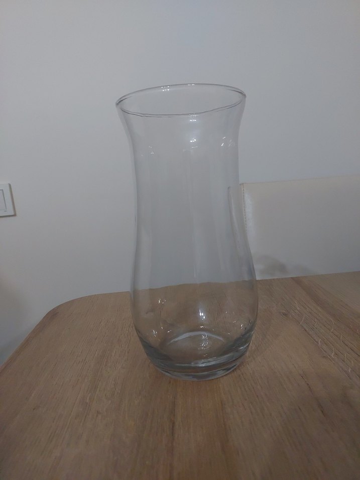 Şeffaf camdan yapılmış, hafif kavisli şekle sahip vazo. Çiçek sergilemek veya dekoratif amaçla kullanılabilir.