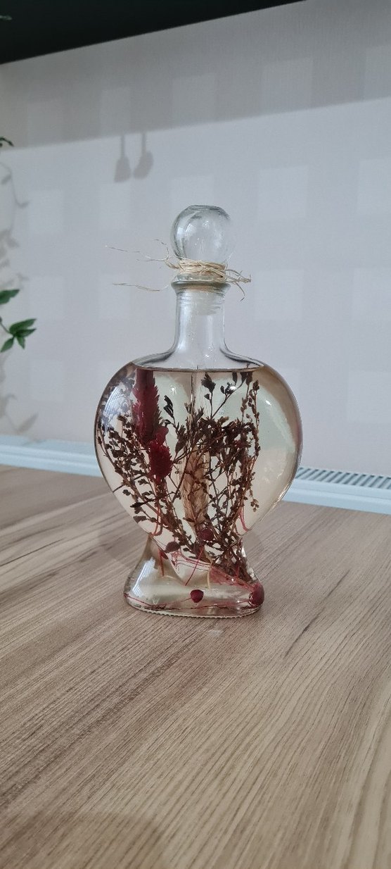 İçi kurutulmuş bitkilerle dolu, açık bordo tonlarında şeffaf camdan yapılmış dekoratif vazo. Üstünde tıpa bulunmaktadır.