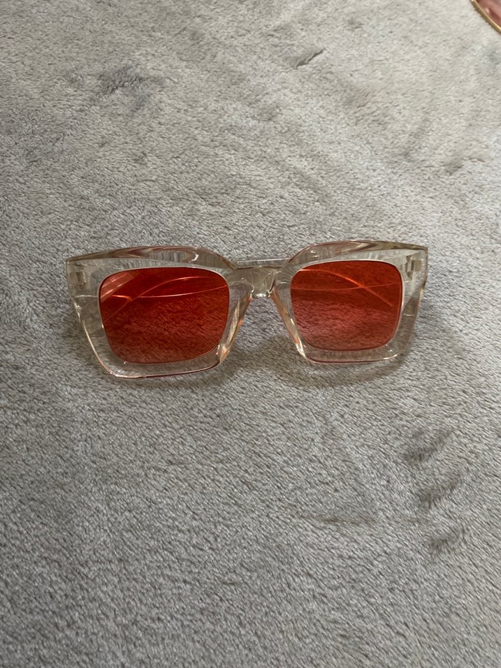 Kadınlar için şeffaf çerçeveli, açık kırmızı camlı güneş gözlüğü. Hiç kullanılmadı.