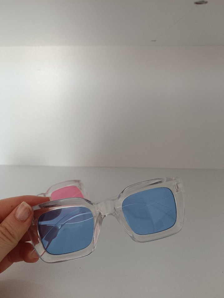 Şeffaf çerçeveli, pastel mavi camlı ve pembe camlı kadın gözlüğü, minimalist ve avangart tasarıma sahip, modayı takip edenler için uygun. kombine uyumlu