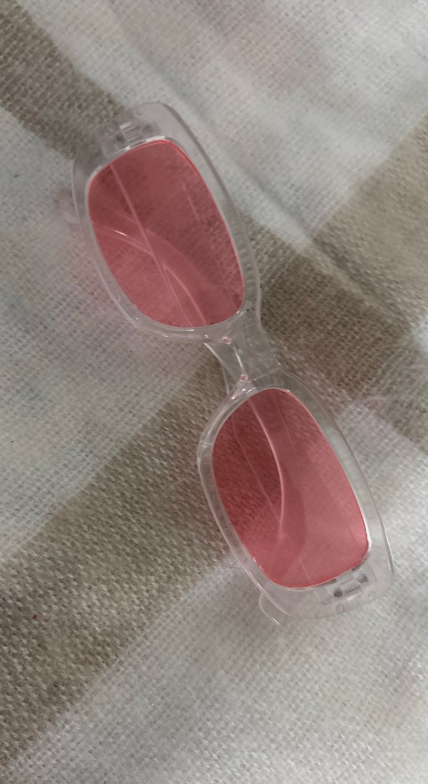 Şeffaf çerçeveli, pastel pembe camlı kadın güneş gözlüğü, minimalist ve avangart tasarıma sahip.