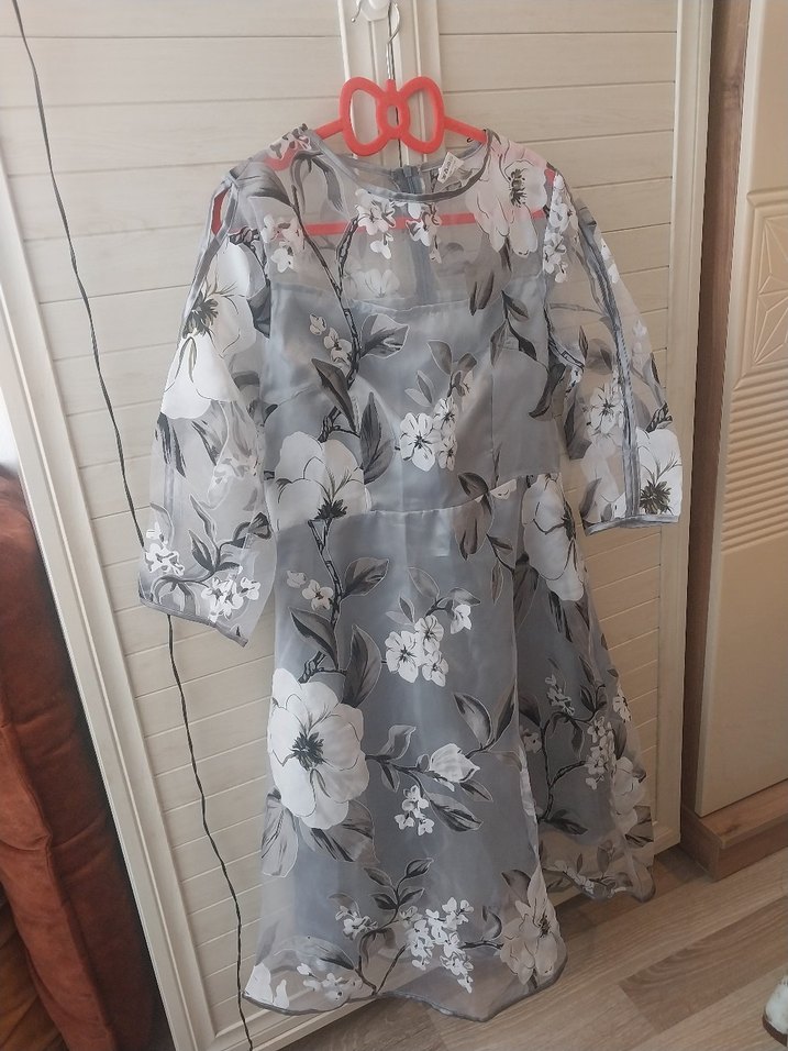 Şeffaf sentetik kumaştan, gri çiçek desenli, elbiseAskısız yakalı ve kısa kollu, günlük kullanıma uygun bohem tarzda.
