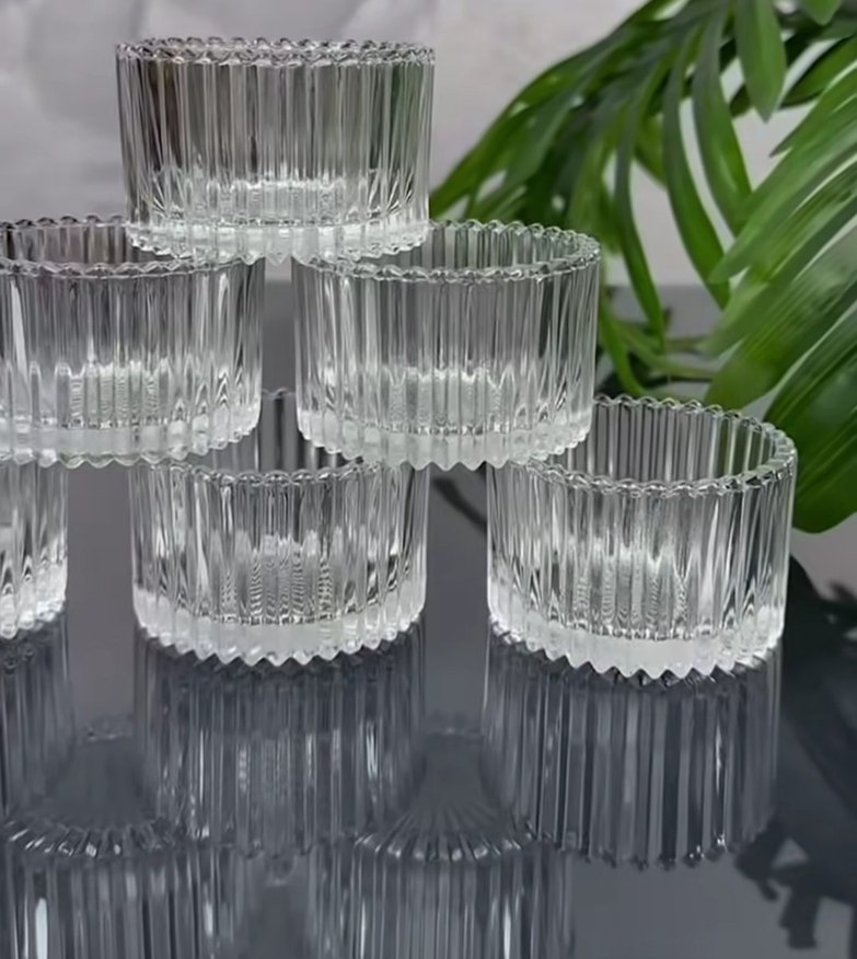 Dikey çizgili dokusu ile şeffaf cam bardak seti, içecek servisi için şık ve zarif bir görünüme sahiptir.