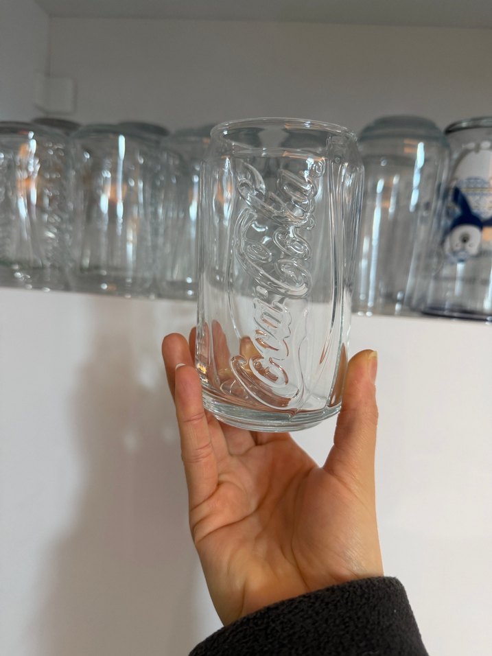 Kabartmalı Coca-Cola logosu olan şeffaf cam bardak, içecek sunumu için uygundur. Klasik silindirik şekle ve pürüzsüz yüzeye sahiptir. 5’li❗️