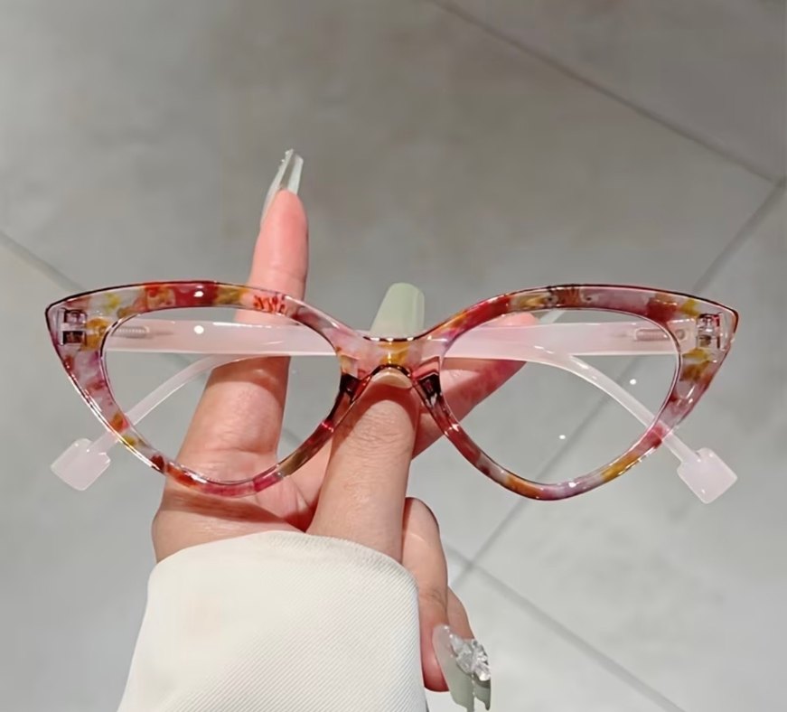Şeffaf ve çok renkli, çağdaş kedi gözü tasarımlı kadın gözlüğü, bohem ve retro tarzları yansıtıyor.