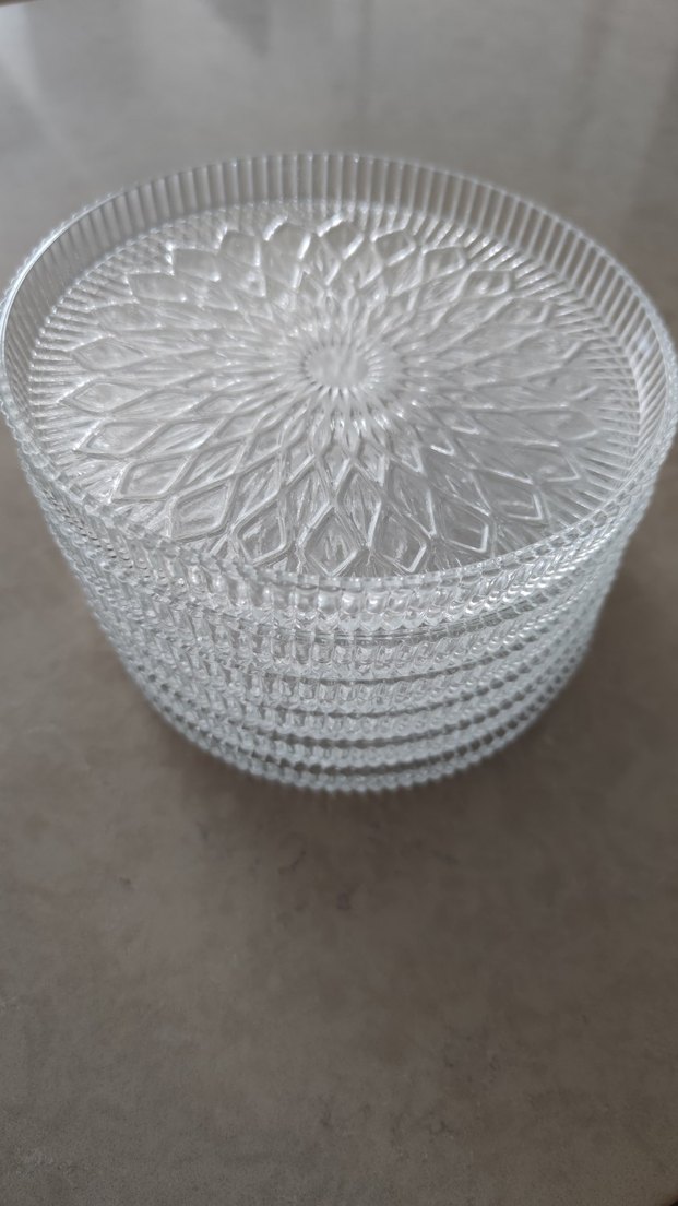 Klasik tarzda, şeffaf ve desenli yüzeye sahip cam tabak seti. Çeşitli yemekler için uygundur. ️