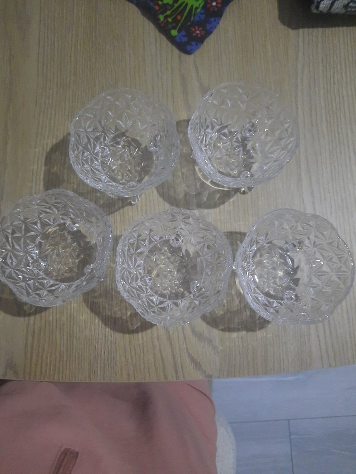 Beş adet şeffaf, geometrik desenli cam kase seti. Her bardak farklı elmas desenine sahip. 5 adet var sıkıntısızlar depoları yoktur.