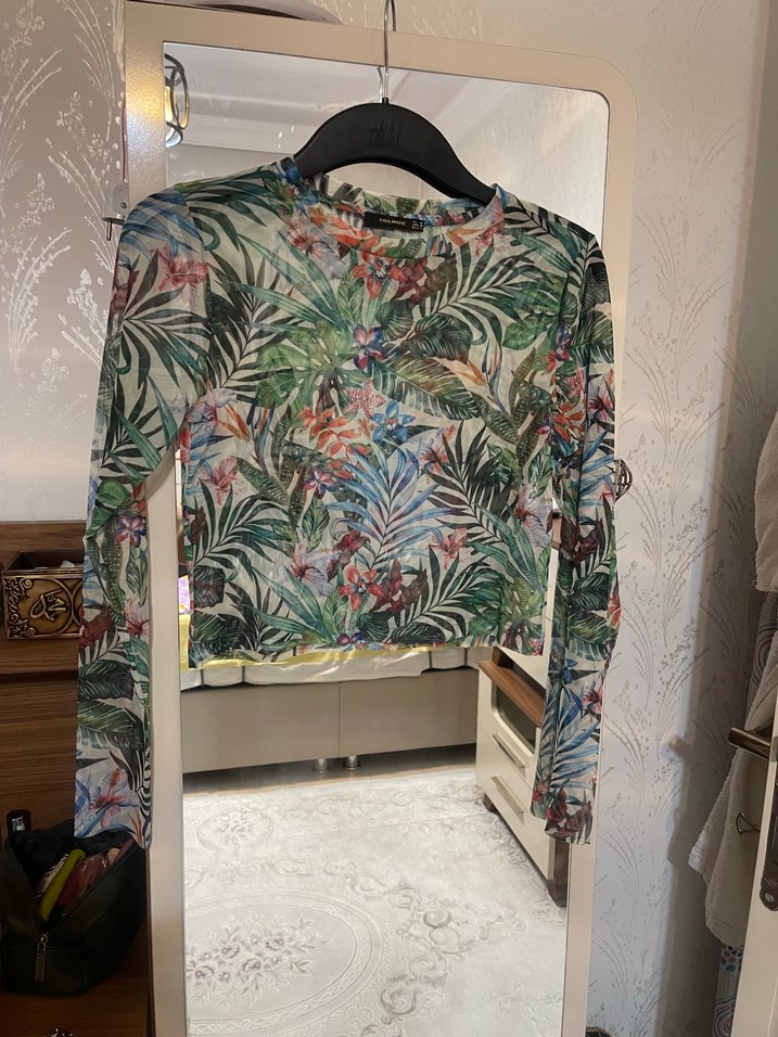 Şeffaf sentetik kumaştan,uzun kollu bir kez giyildi sıfırdan farksızme beden esnek olduğu için L bedeni de olur transparan crop bluz