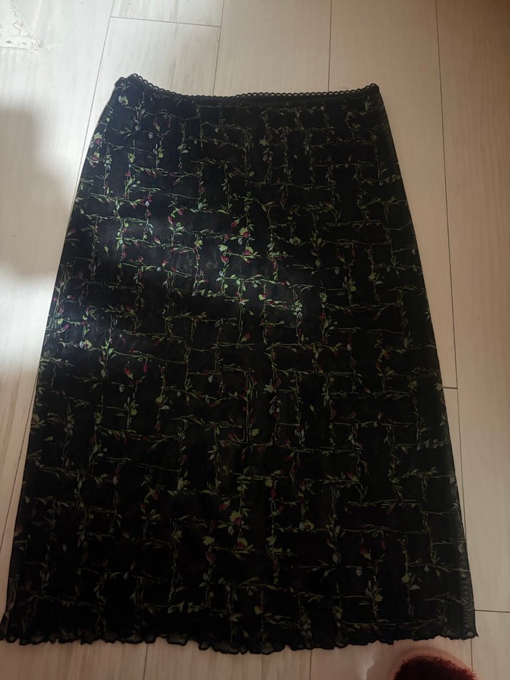 Şeffaf sentetik kumaştan yapılmış, desenli ve siyah renkli, uzun ve vücuda oturan gotik tarzda bir etek.