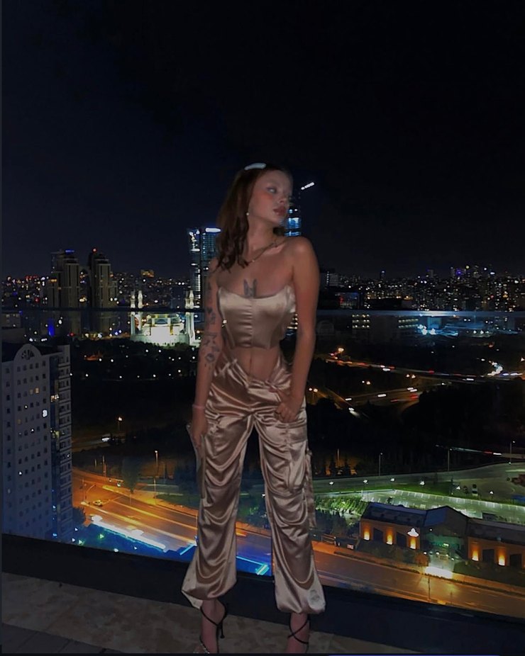 Şeffaf detaylara sahip, straplez ve vücuda oturan bu kadın tulumu, parlak altın rengi ve saten dokusuyla dikkat çeker. Midi boyda, cesur sokak stili parti kıyafeti. ✨