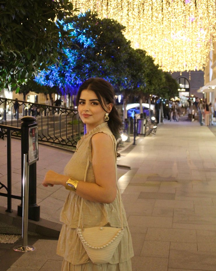 Şeffaf etnik desenlere sahip,boğazlı yaka ve bol kesim bej uzun elbise. Romantik gece için uygun, kolsuz tasarımlı.