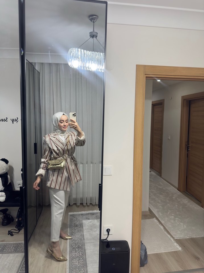 Bej zebra desenli, normal boy, şeffaf detaylı kadın blazer. Uzun kollu ve kesim olarak rahat, sentetik kumaştan üretilmiş, günlük sokak modasına uygun.