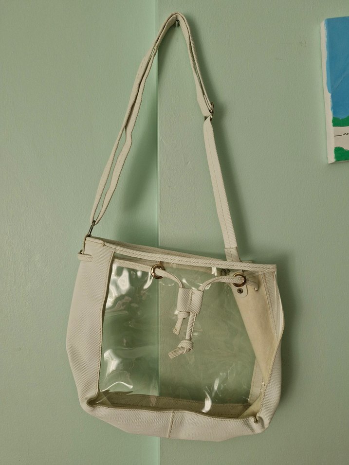 Ayarlanabilir askılı, şeffaf detaylı beyaz kadın çantası. Modern ve şık bir görünüm sunar. içinde makyaj çantası da mevcut