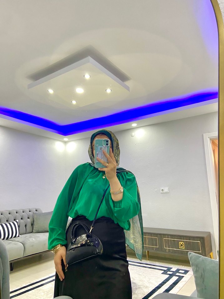 Şeffaf, ipeksi kumaştan, bağlamalı desenli, yüksek yakalı ve uzun kollu haki yeşili midi bluz, rahat kesimlidir.