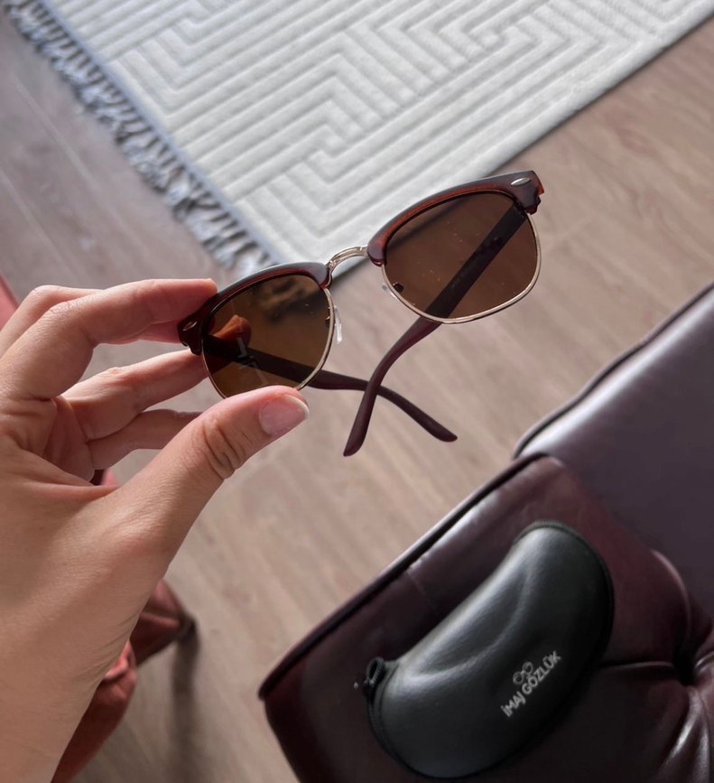 Parlak kahverengi çerçeveli, şeffaf detaylara sahip kadın güneş gözlüğü. Minimalist ve retro sokak stilini yansıtır, bohem ve hippie tarzlara uygundur. ️