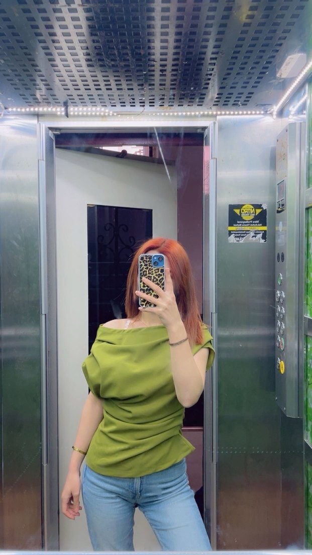 Kayık yaka, şeffaf detaylı, kısa kollu, bol kesim haki bluz. Sentetik kumaştan, trend günlük tarz için uygun.