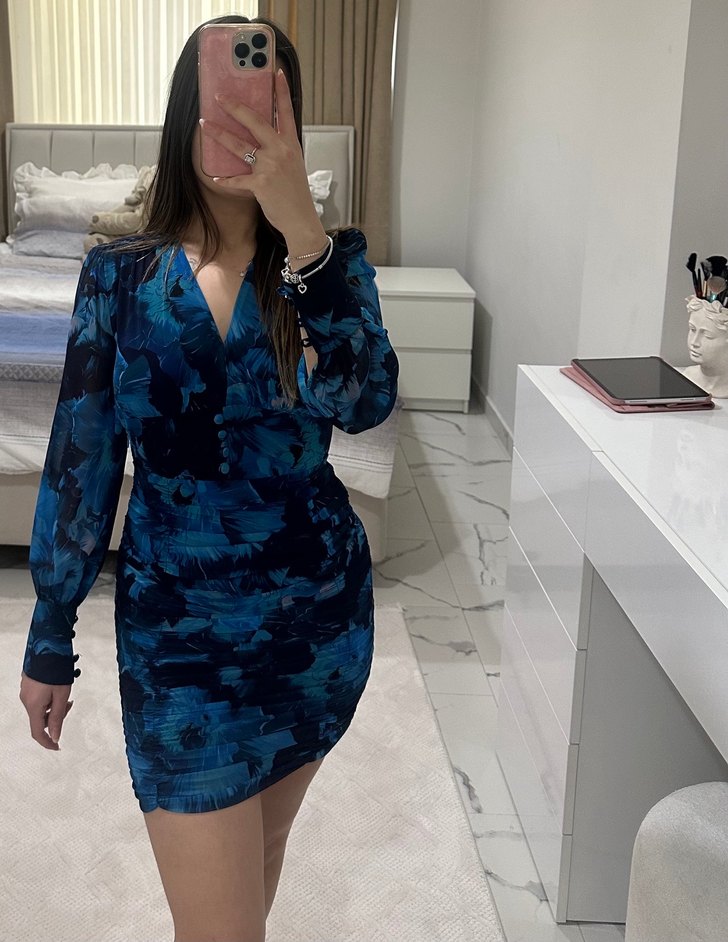 V yaka ve uzun kollu, şeffaf detaylı, koyu mavi batik desenli mini elbise. Gösterişli ve formda, romantik buluşmalar için uygun.