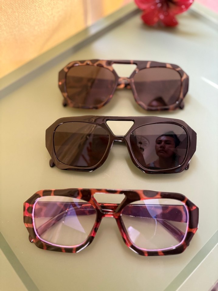 Koyu kahverengi, şeffaf detaylı retro tarzda kadın güneş gözlüğü, bohem ve hippie görünüm için geometrik çerçeveli.