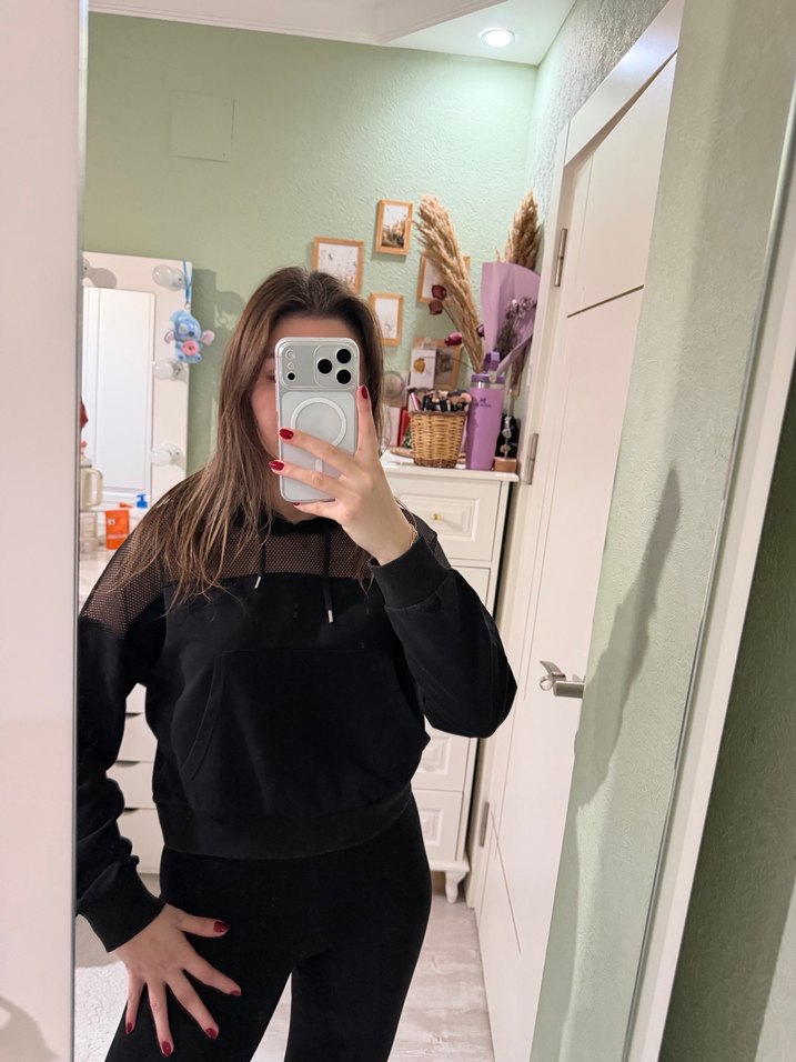 Yüksek yakalı ve uzun kollu, şeffaf üst kısımlı siyah, vücuda oturan sweatshirt. Yumuşak ve sıcak kumaştan, günlük kullanıma uygun.