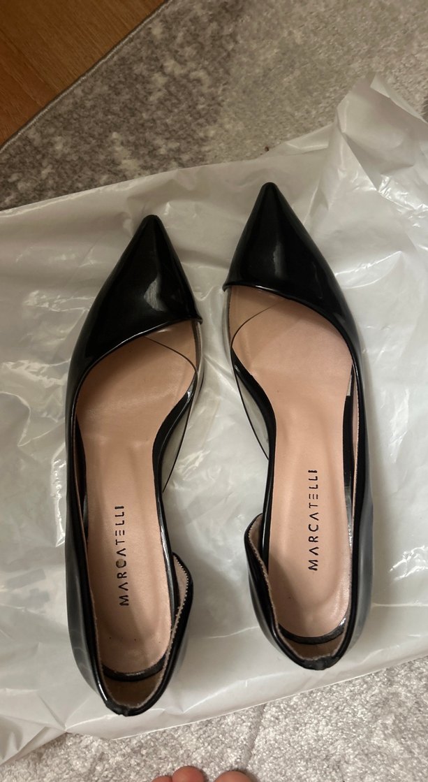 Şeffaf yan panelli, sivri burunlu siyah stiletto. Ofis kullanımı için uygun, kauçuk malzemeden yapılmıştır.