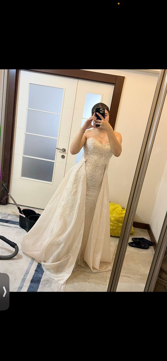 Şeffaf detaylı, straplez ve vücuda oturan bu uzun nişan elbisesi, modern klasik tarzda ve açık beyaz renktedir. Kolsuz ve desensizdir, gösterişli bir düğün görünümü için uygundur. Nişan içindir özel dikimdir kolları mevcuttur 38 bedendir