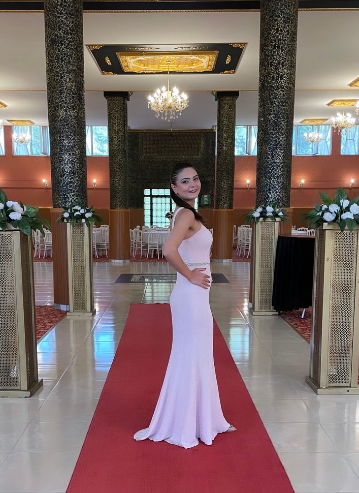 Uzun, pembe ve vücuda oturan bu abiye, straplez yaka ve şeffaf detaylarla modern ve göz alıcı bir tarz sunar. İnce askılı kolları ve hafif desenleri bulunur.