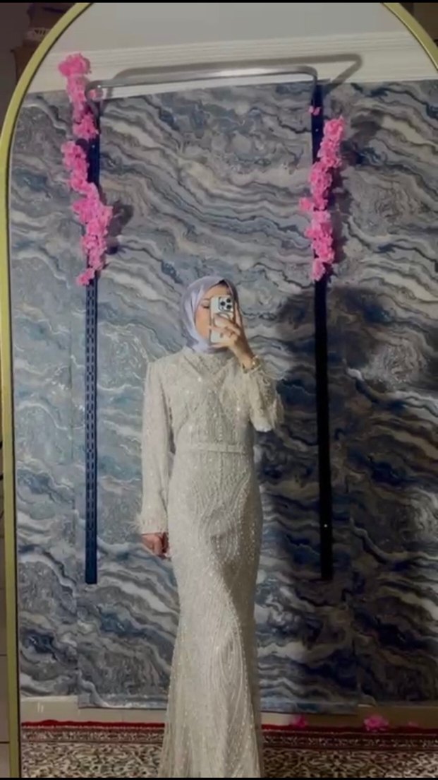 Şeffaf detaylı, uzun ve tam oturan beyaz abiye elbise, yüksek yakalı ve uzun kollu, sade ve mütevazı bir tasarıma sahiptir.