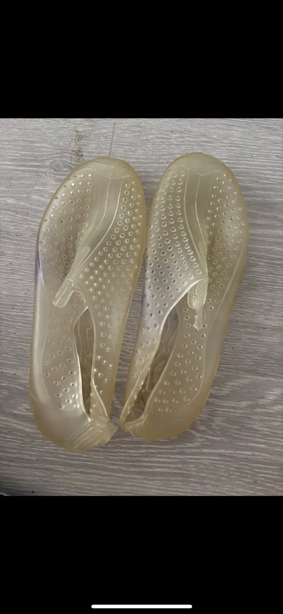 Şeffaf kauçuk malzemeden yapılmış, açık beyaz tonlu erkek plaj ayakkabısı. Minimalist ve klasik tarzda, modaya uygun bir seçim.
