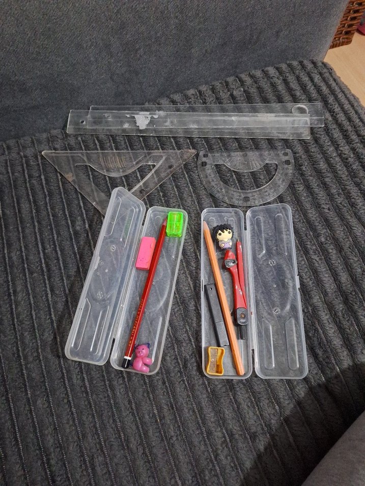 Şeffaf cetvel, açıölçer ve üçgen ile birlikte kalem, kalemtraş ve küçük silgiler içeren kalem kutuları bulunur. ✏️