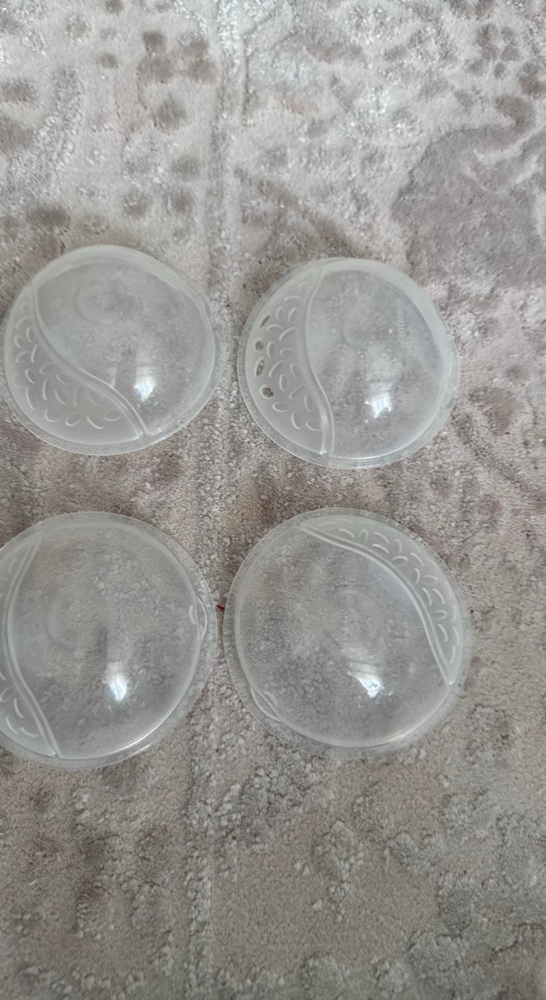 Şeffaf ve bej detaylı dört adet göğüs pedi seti, rahat ve gizli kullanım için uygundur. Kolay temizlenir ve tekrar kullanılabilir.