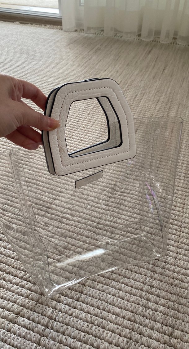 Gri ve beyaz baskılı detaylara sahip şeffaf plastik kadın el çantası. Minimalist ve çağdaş tarzda, günlük kullanıma uygun, modaya uygun bir çanta.