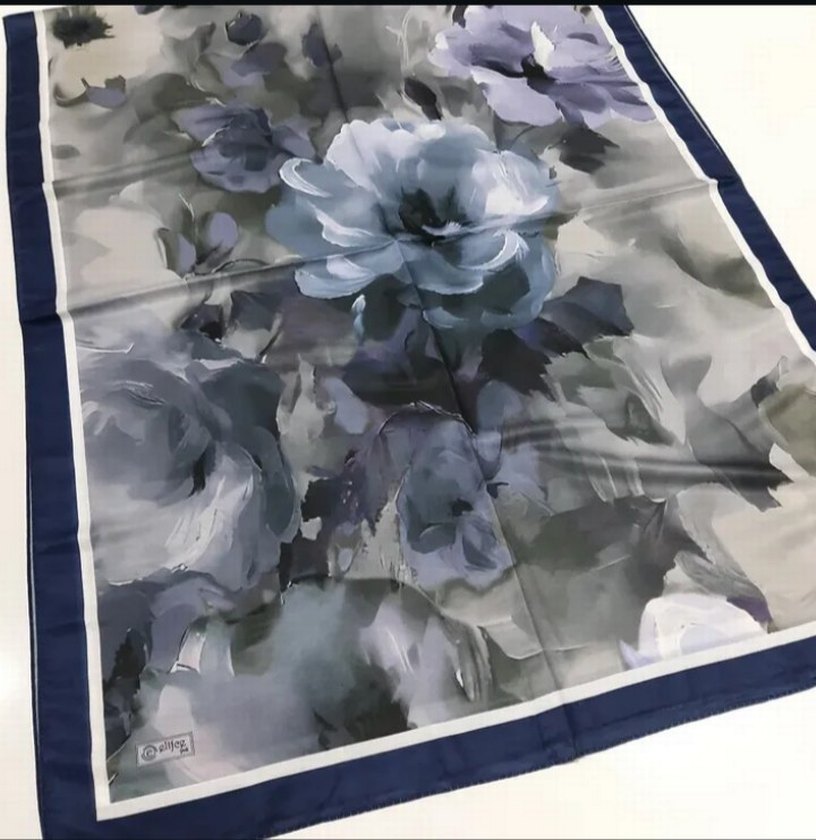 Sentetik kumaştan, gri ve mavi çiçek desenli şeffaf kadın fuları. Vintage dokunuşlu, çağdaş ve modaya uygun bir tasarım sunar.