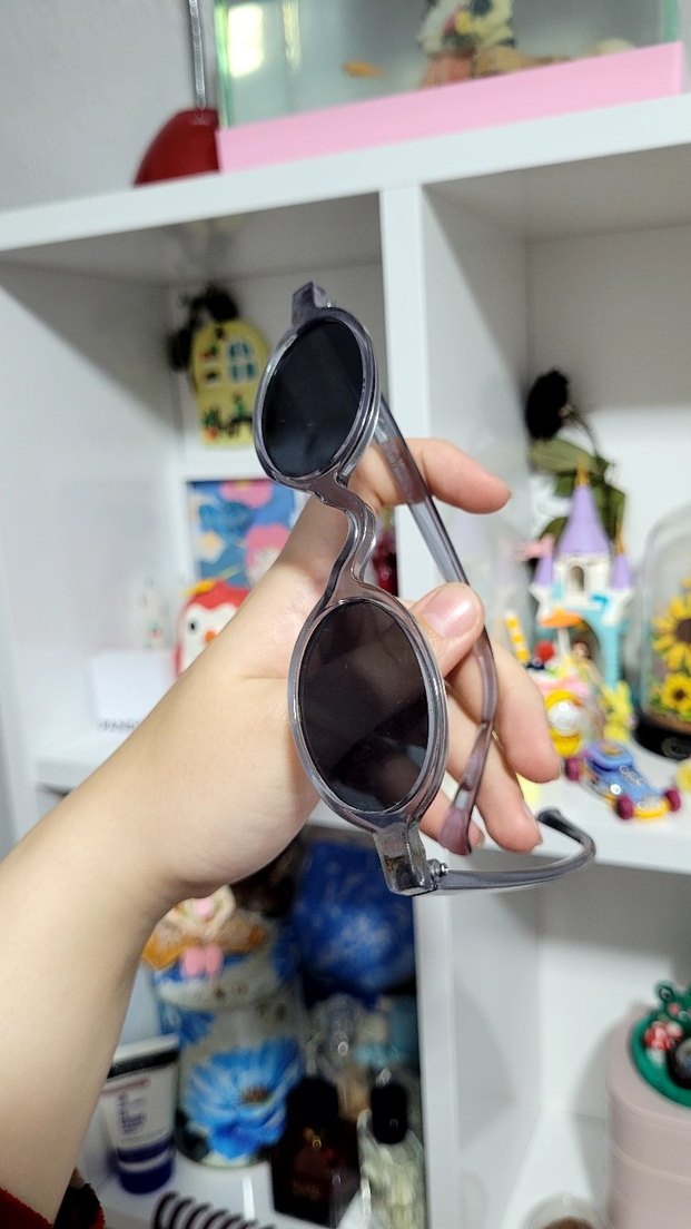 Şeffaf gri çerçeveli, yuvarlak lensli kadın güneş gözlüğü. Minimalist ve rahat sokak stili için uygundur. ️