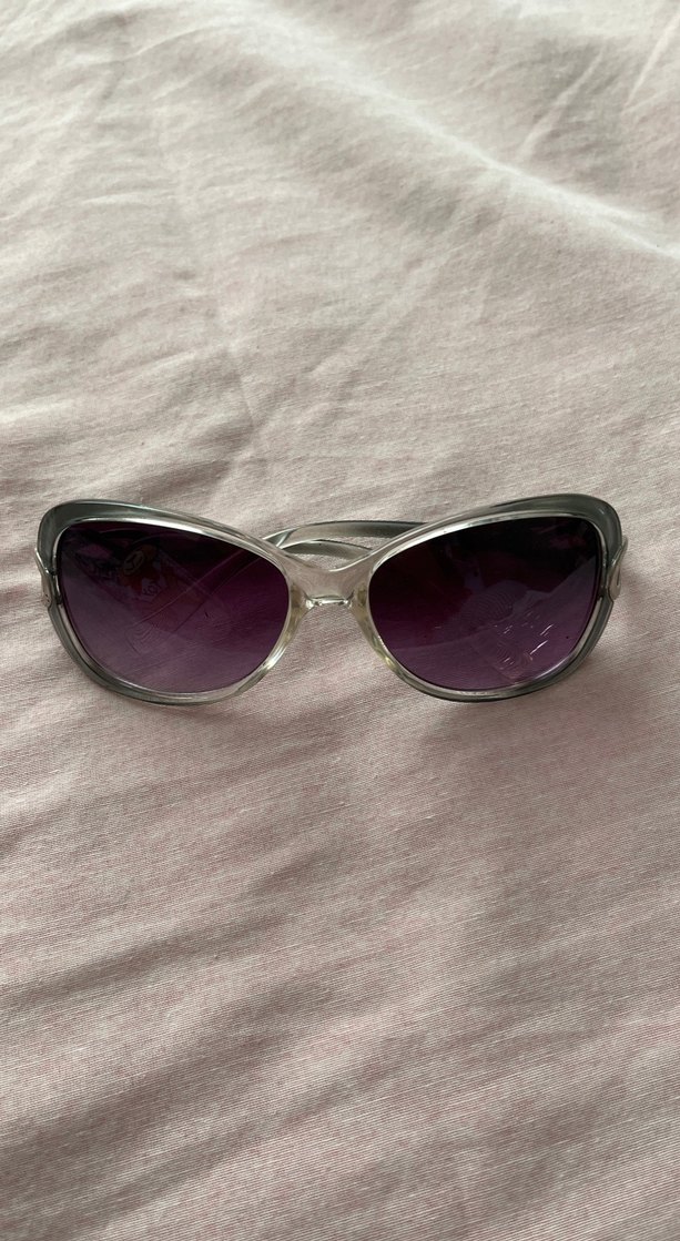 Şeffaf çerçeveli, mor camlı gri kadın güneş gözlüğü. Paris tarzı, retro ve karşı kültür etkisi taşır. ️
